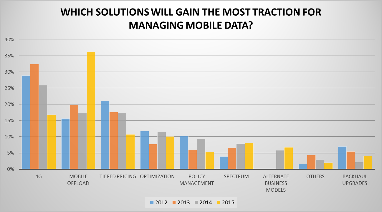 Wi-Fi accounts for bulk of the mobile data traffic in almost all major markets hence the rise of mobile offload as the preferred solution for managing data growth. But, LTE deployment, spectrum acquisition, and tiered pricing remained the top solutions for the operators.